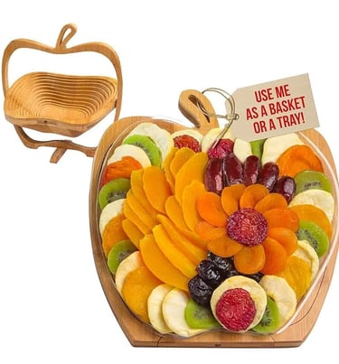 Delicious dried fruit Gift Tray comes on foldable Wooden Fruit Bowl.