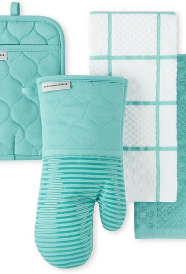 Set includes two absorbent, textured terrycloth kitchen towels, one dual-layered quilted pot holder, and one dual-layered oven mitt with a non-slip silicone grip and high heat resistance