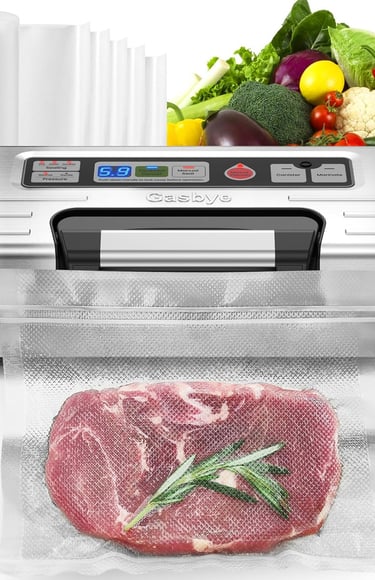 The Gasbye Vacuum Sealer Machine is equipped with dual heat sealing strips and a high-efficiency 95kPa vacuum pump, delivering stronger suction and tighter seals. Perfect for long-term food storage, it keeps air out and freshness in for months